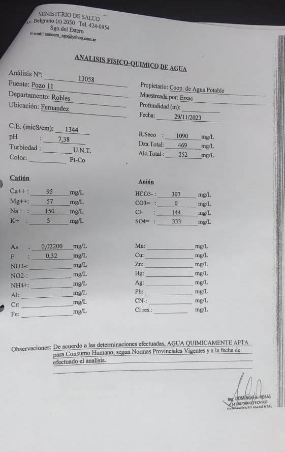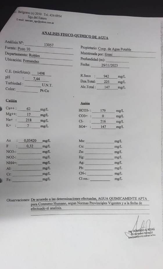 Con el objetivo de garantizar la provisión de agua segura y de calidad a toda la población, como es habitual, la Cooperativa de Provisión de Servicios Públicos “Fernández” Limitada, realizó en los laboratorios del Ministerio de Salud de la Provincia, el análisis físico químico del agua de la red, cuyos resultados arrojan que es completamente potable.