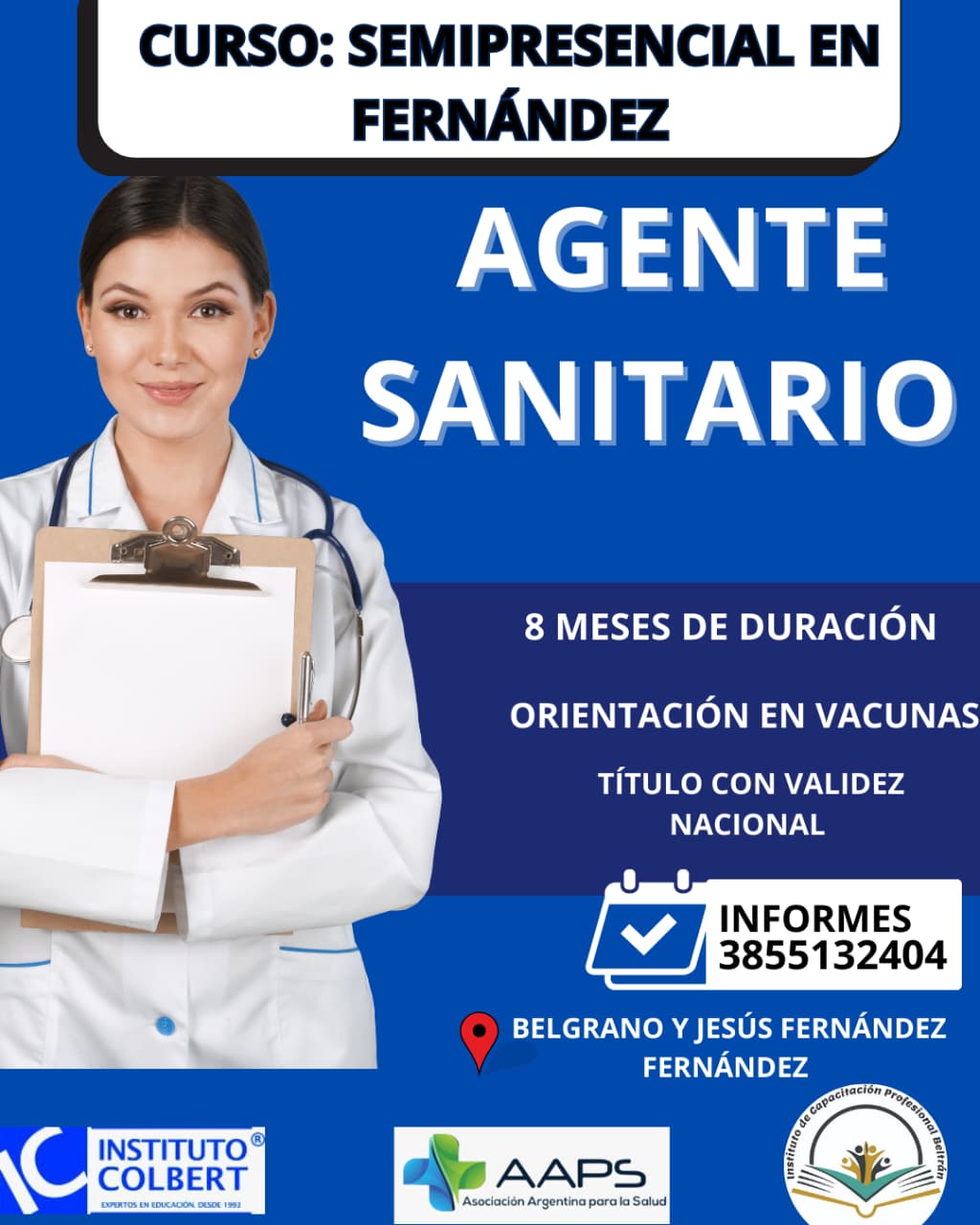 Otro de los cursos que dictará el Instituto de Capacitación Profesional Beltrán es el de Agente Sanitario de carácter semipresencial, con 8 meses de duración y está orientado en Vacunas. Otorga un título con validez nacional y es avalado por el Instituto Colbert y la Asociación Argentina para la Salud.