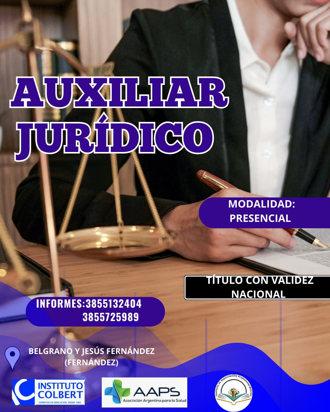 También otro de los cursos que tiene que ver en el ámbito de la justicia es el de auxiliar jurídico de modalidad presencia, título con validez nacional y es avalado también por el Instituto Colbert y la Asociación Argentina para la Salud.
