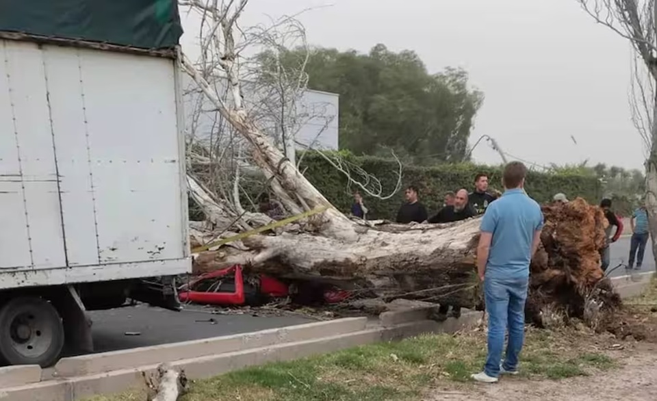 El viento desde el sur había comenzado pasadas las 16 en la provincia. Además del incidente de la mujer de 37 años, un repartidor resultó gravemente herido en Las Heras luego de que un árbol cayera sobre su moto. Una cámara de seguridad registró el momento en que el árbol se desploma y el motociclista -un joven de 26 años- logra saltar para evitar quedar aplastado.