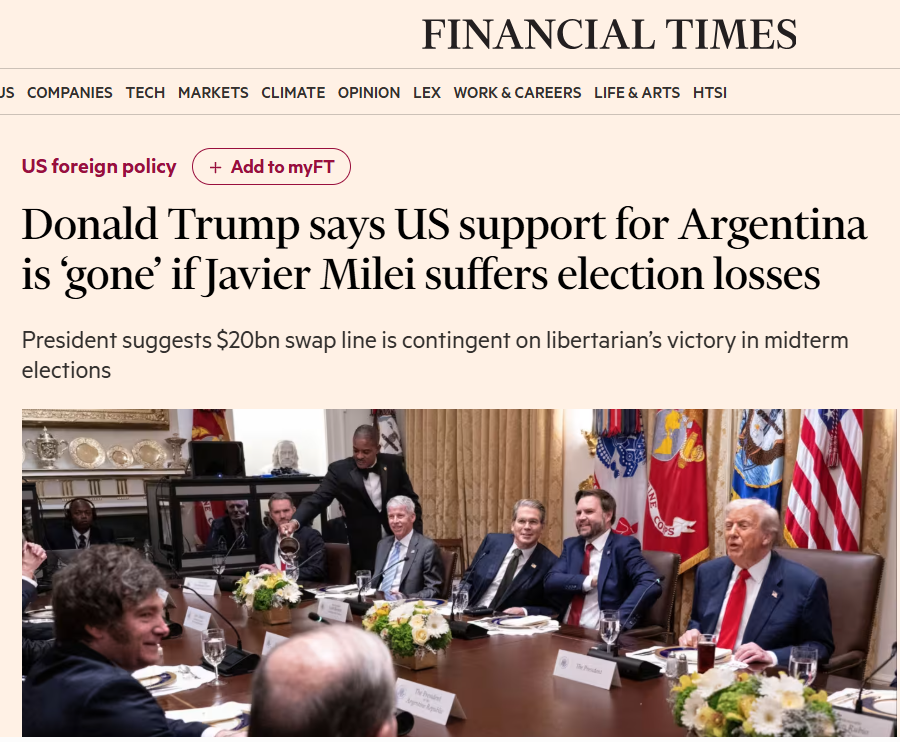 Para el diario británico, Trump dejó claro que el swap por 20.000 millones de dólares anunciado por el Tesoro de EE.UU. está supeditado al éxito político de Milei en las elecciones legislativas del 26 de octubre: “Las elecciones son muy pronto… Creo que la victoria es muy importante… nuestras aprobaciones dependen en cierta medida de quién gane las elecciones”, dijo el republicano.