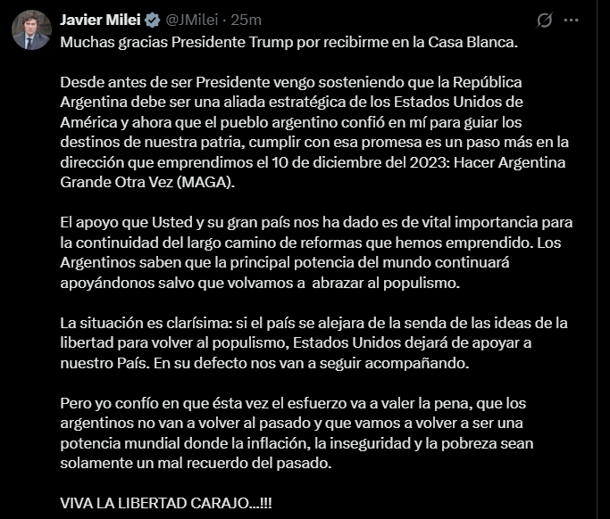 Lejos de distanciarse, Milei celebró la reunión en X: “Muchas gracias Presidente Trump por recibirme en la Casa Blanca… Los argentinos saben que la principal potencia del mundo continuará apoyándonos salvo que volvamos a abrazar el populismo. ¡Viva la libertad, carajo!”.