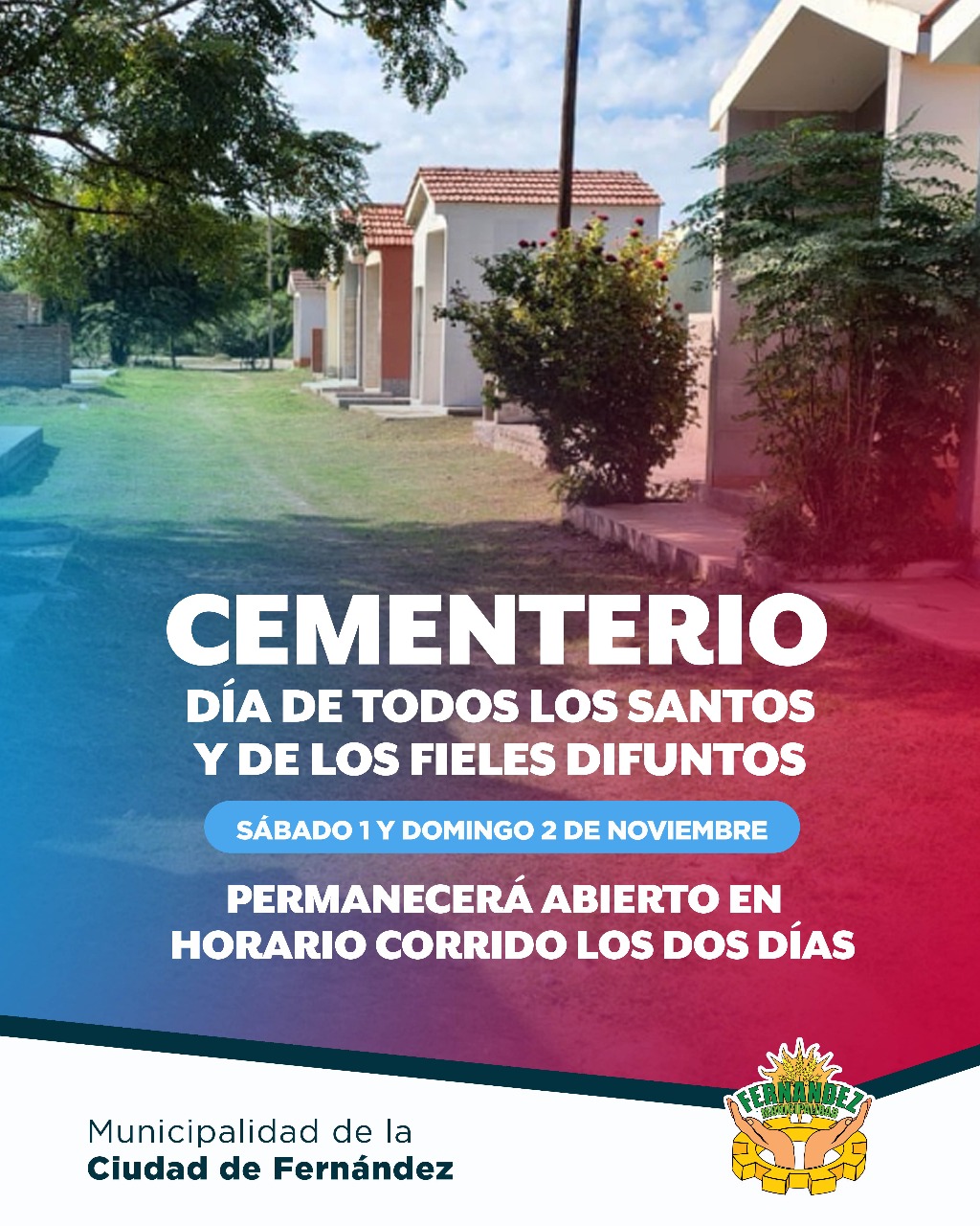 El 1 y 2 de noviembre el cementerio “Cristo Redentor” de la ciudad de Fernández, permanecerá abierto las dos jornadas, tanto la del día de todos los santos como el día de los fieles difuntos. El día domingo habrá misa a las 8:30 horas. Habrá un operativo integral de tránsito y seguridad para coordinar la circulación en el sector.