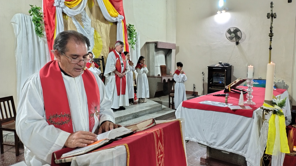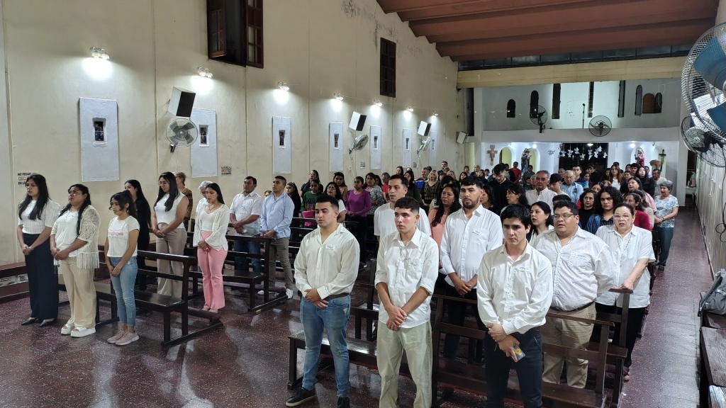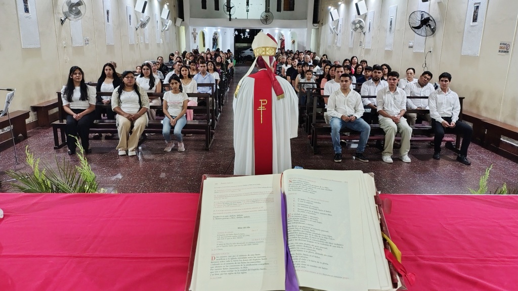 El obispo auxiliar de la diócesis de Santiago del Estero, Enrique Martínez Ossola, junto al Pbro. Vicente Avellaneda de la Parroquia Nuestra Señora del Rosario de la ciudad de Fernández, celebró la misa de Confirmación de adultos este viernes por la noche en el templo de calle 9 de Julio.