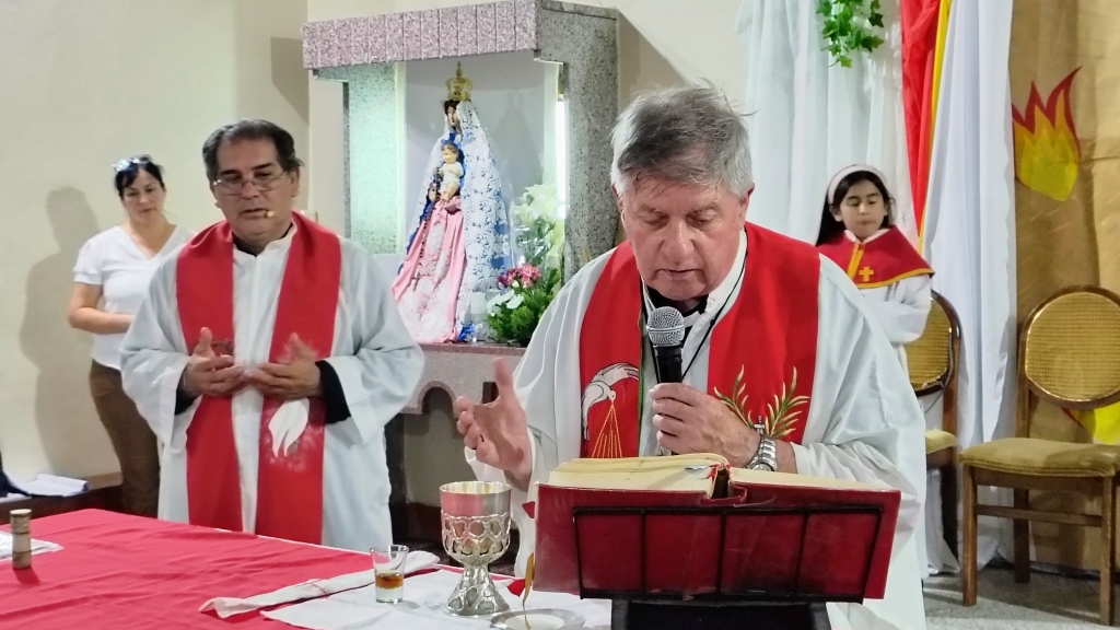 El obispo auxiliar de la diócesis de Santiago del Estero, Enrique Martínez Ossola, junto al Pbro. Vicente Avellaneda de la Parroquia Nuestra Señora del Rosario de la ciudad de Fernández, celebró la misa de Confirmación de adultos este viernes por la noche en el templo de calle 9 de Julio.