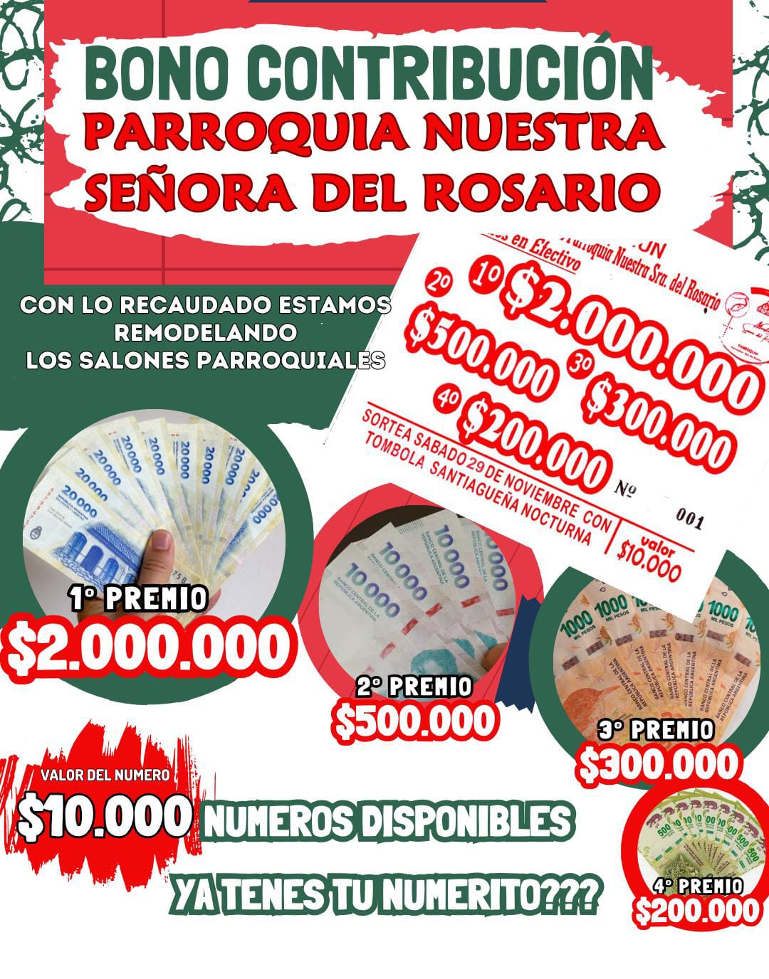 El primer premio es de 2 millones; el 2do premio 500 mil pesos; el 3er premio es de 300 mil. Sortea el 29 de noviembre y el número sale $10 mil.