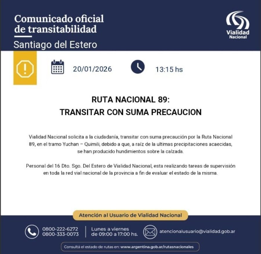 El temporal de los últimos días dejó secuelas peligrosas en la red vial del interior provincial. Vialidad Nacional emitió un comunicado urgente advirtiendo a los conductores sobre la presencia de grietas y hundimientos en la calzada de la Ruta Nacional 89.