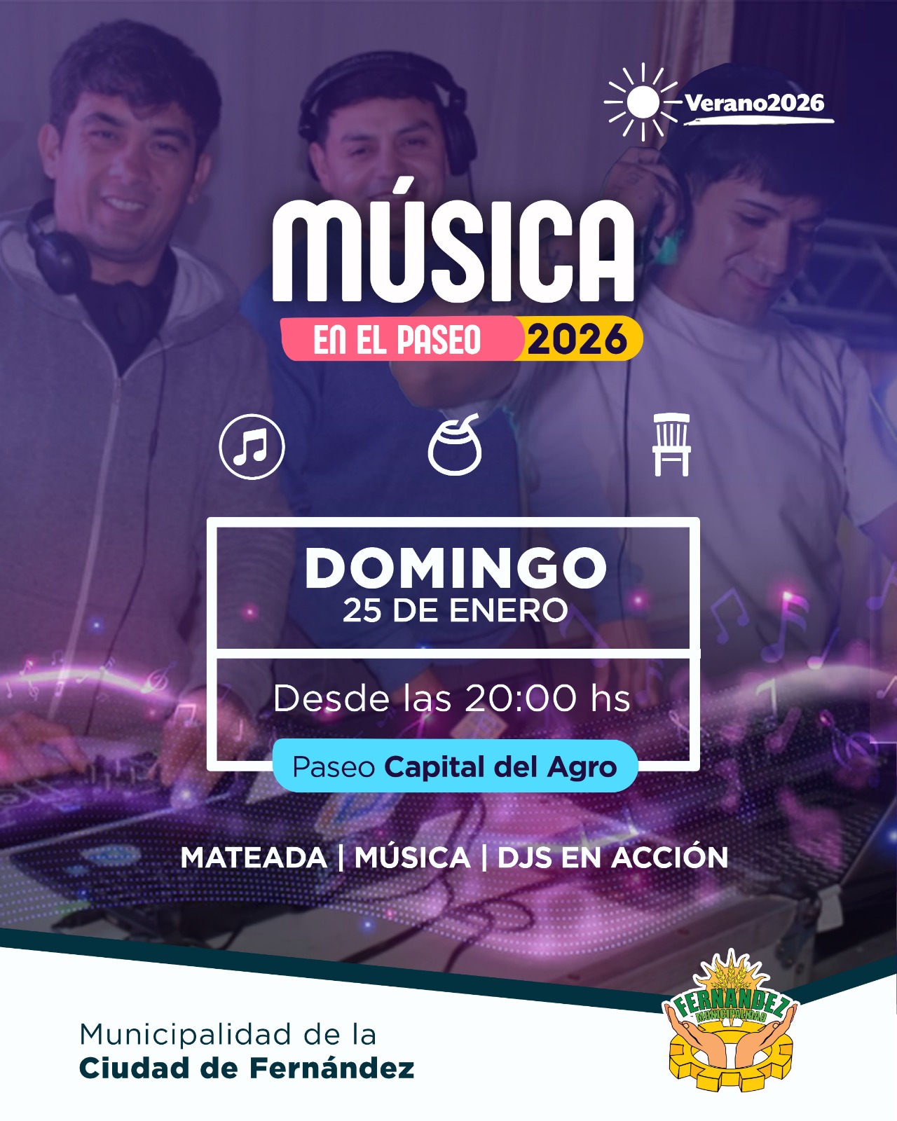 Desde la Dirección de Cultura a cargo de Leonardo Fernández, informaron que para este domingo 25 de enero se organizó otro evento en el Paseo Capital del Agro. Se trata de “Música en el Paseo” que será desde las 20 horas, donde habrá Djs locales en acción, música, artesanos y puestos de venta.