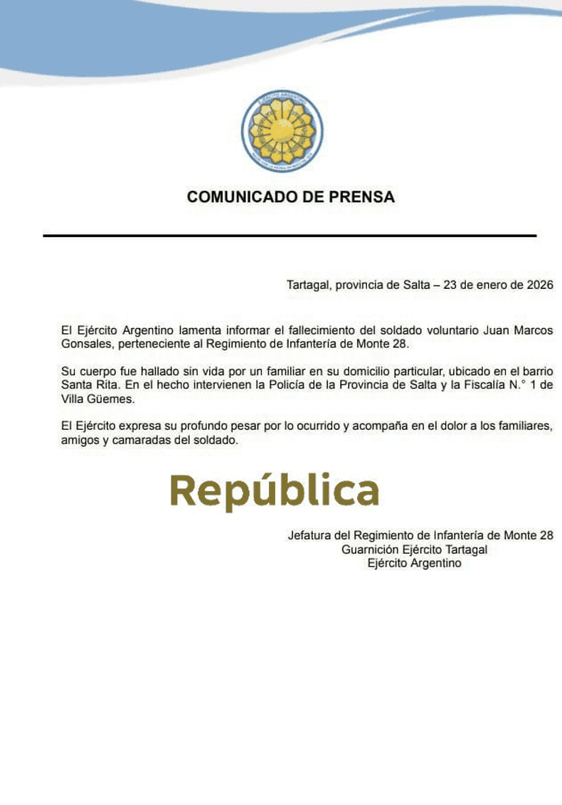 Otra muerte sacude al Ejército Argentino, ya que este viernes por la mañana fue hallado sin vida un soldado voluntario de 25 años que pertenecía al Regimiento de Infantería de Monte 28, en Tartagal, Salta. El uniformado, que no asistió a cumplir sus funciones, fue encontrado muerto en su vivienda: ya es el quinto caso en más de un mes en las Fuerzas Armadas.