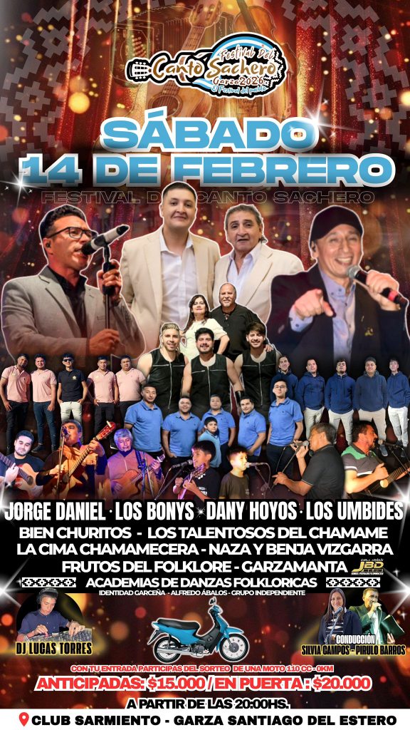 El Festival del Canto Sachero volverá a encender la noche de Garza el sábado 14 de febrero de 2026, desde las 20, en el Club Sarmiento. En el marco del fin de semana turístico por carnaval, la localidad se alista para una nueva edición de una fiesta que ya es parte de la identidad cultural santiagueña.