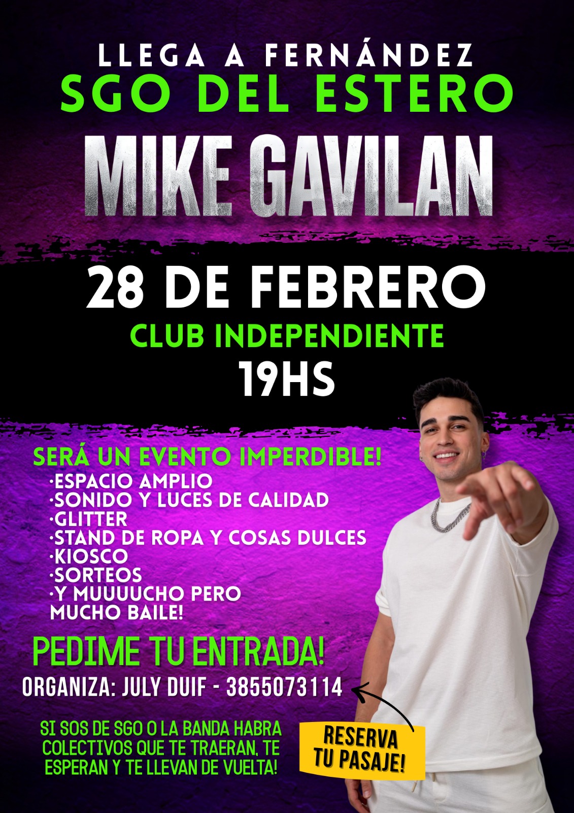 La ciudad de Fernández se prepara para vivir una jornada a puro movimiento y energía. Por primera vez, el reconocido presentador y bailarín paraguayo Mike Gavilán desembarca en el interior de Santiago del Estero (Fernández), para encabezar un evento que promete ser una verdadera fiesta del ritmo.