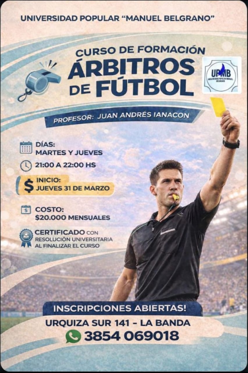 La Universidad Popular “Manuel Belgrano”, ubicada en la ciudad de La Banda, anunció el lanzamiento de su nuevo Curso de Formación de Árbitros de Fútbol. La propuesta busca brindar una salida laboral profesionalizada a los apasionados del deporte en la región.