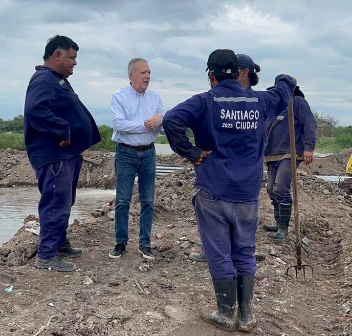 Durante su recorrido, el mandatario visitó la zona rural de Los Cardozos (departamento Capital), el sector del desagüe pluvial sur y la Avenida Costanera, puntos donde el agua ha ganado terreno en las últimas horas debido a la erogación del Dique Frontal de Las Termas, que ya supera los 1.800 m³/s.