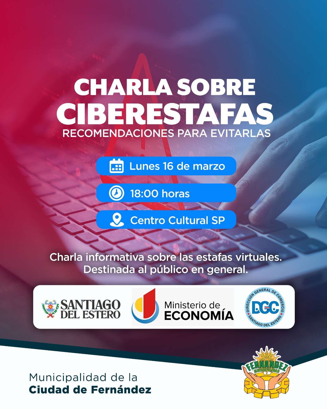Con el objetivo de acercar herramientas de seguridad digital a la comunidad, este lunes 16 de marzo se llevará a cabo una importante charla informativa sobre estafas virtuales en la ciudad de Fernández.