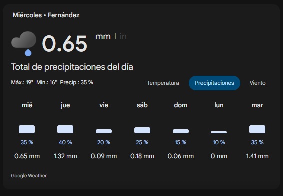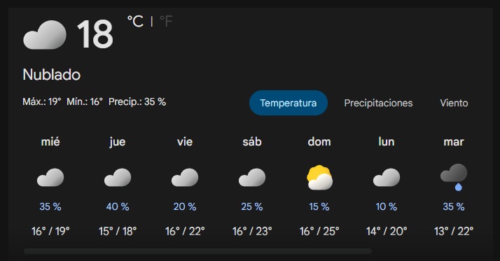 A partir del viernes 24, el panorama comienza a mejorar. Si bien el cielo se mantendrá nublado, las probabilidades de lluvia caen drásticamente a un 20%. La temperatura iniciará un leve ascenso, alcanzando los 22°C, marcando el final de las condiciones adversas.